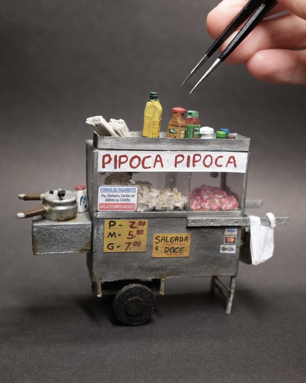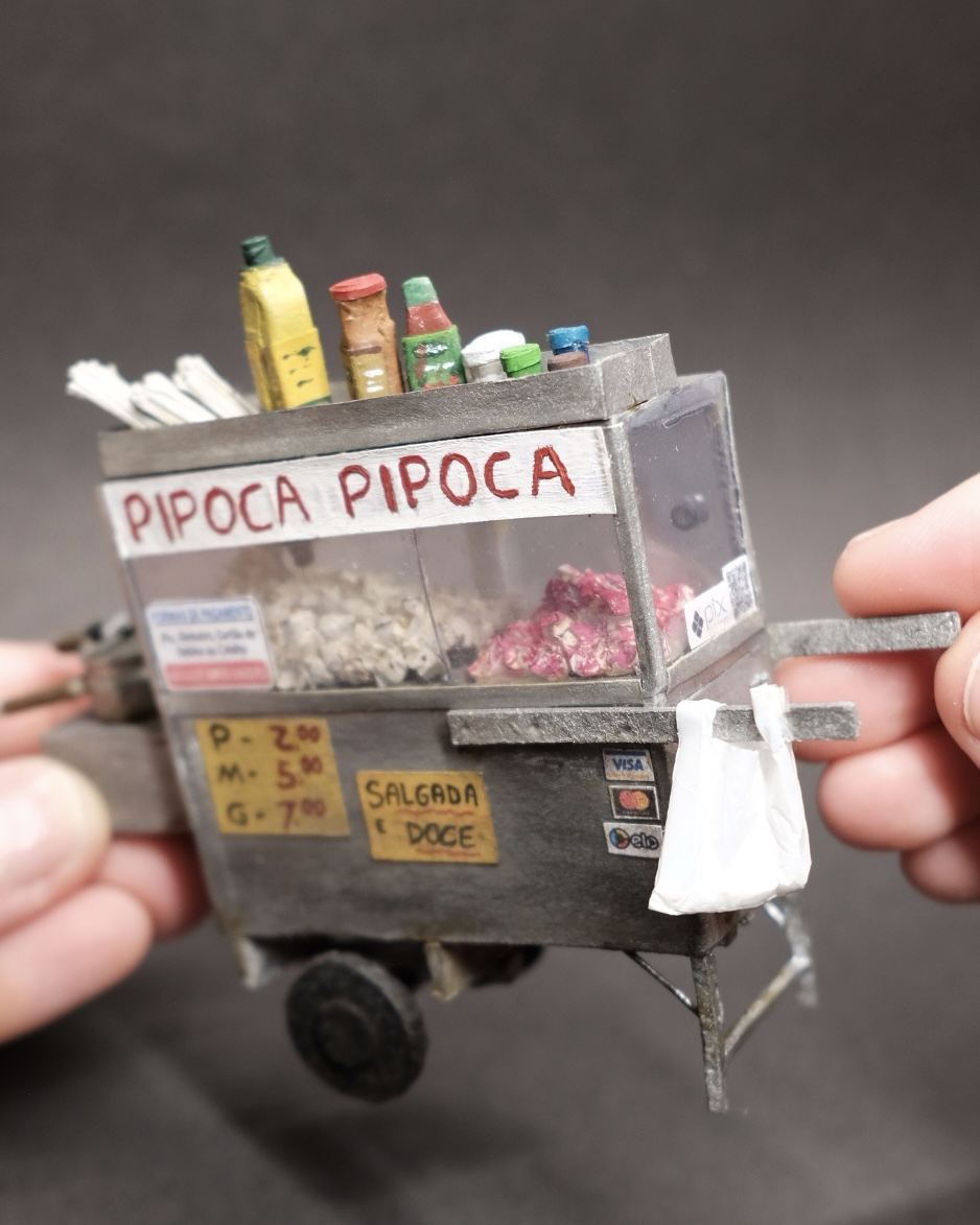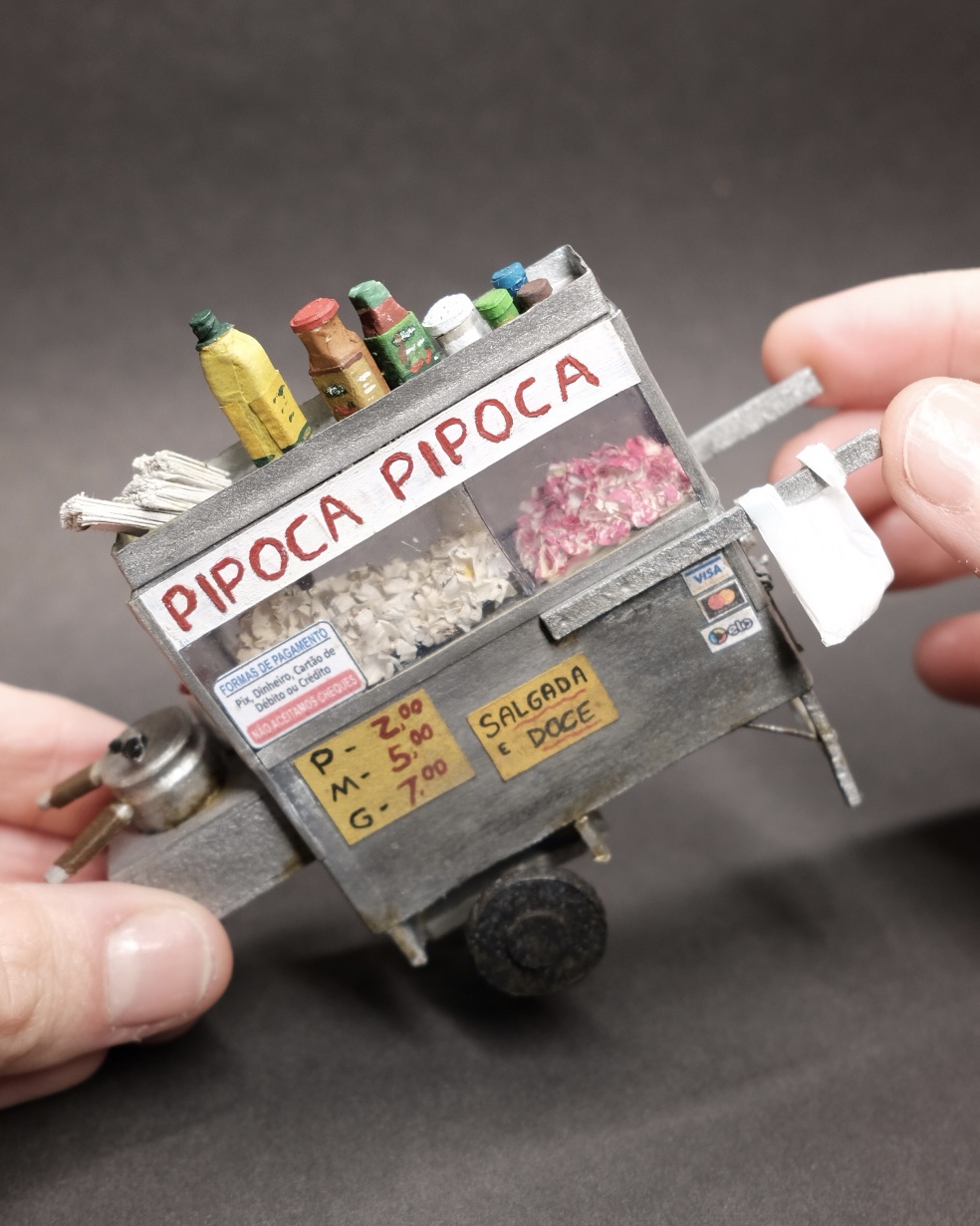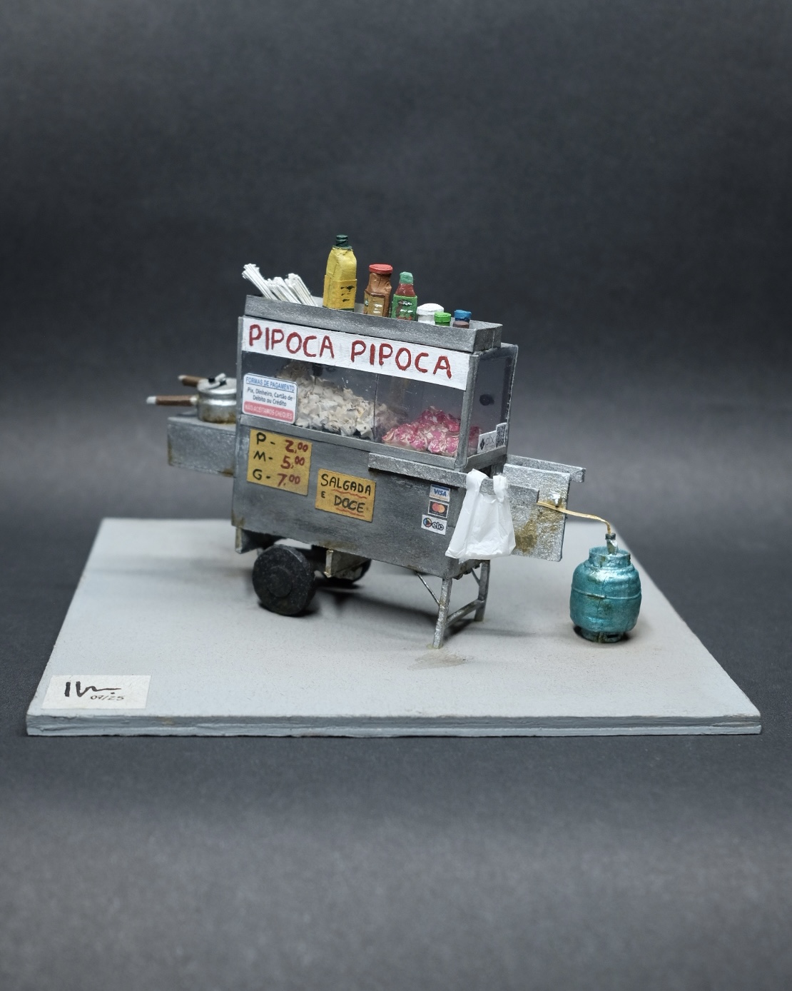 Peça desenvolvida para despertar a memória afetiva que os carrinhos de pipoca carregam e, quem sabe, até estimular o olfato de quem a observa. Esta obra é um convite para acessar lembranças e o cheirinho aconchegante que esses carrinhos espalhavam, e continuam espalhando, pelas praças e ruas do Brasil.